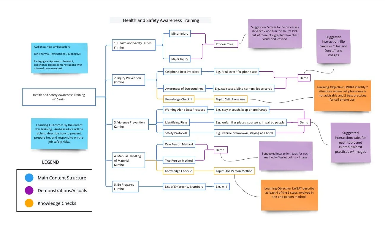 I created this content map for a major telecommunications company. This course outlined the health and safety awareness protocols that new ambassadors would use at events.